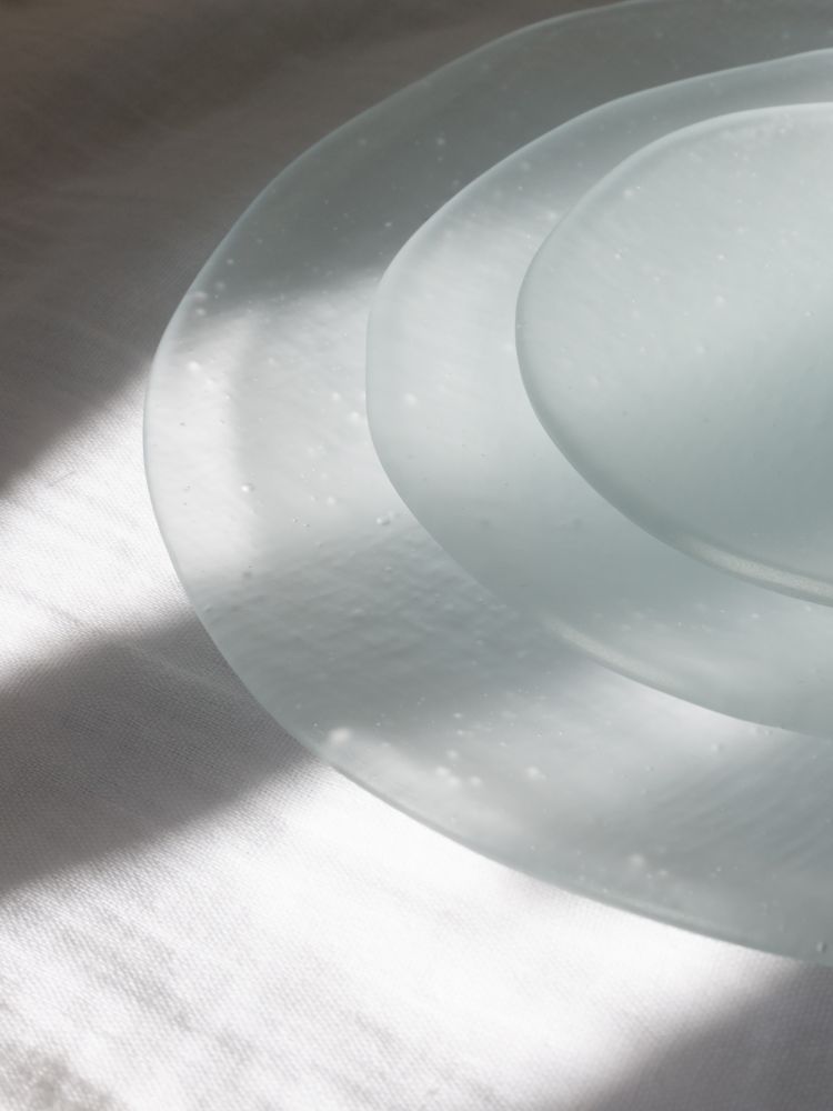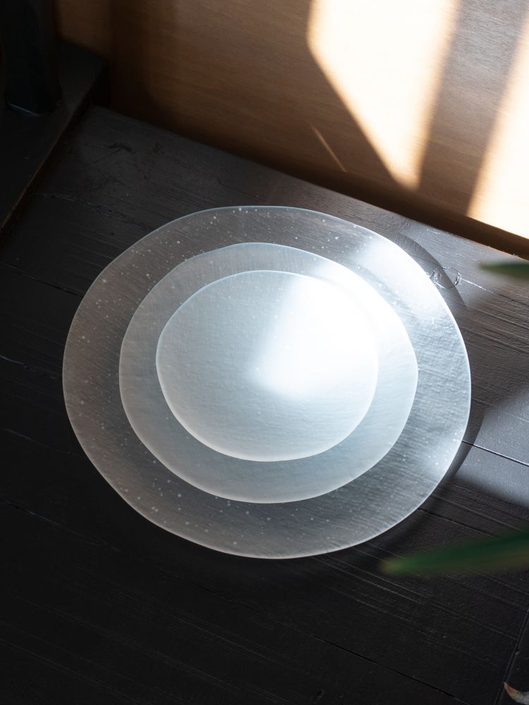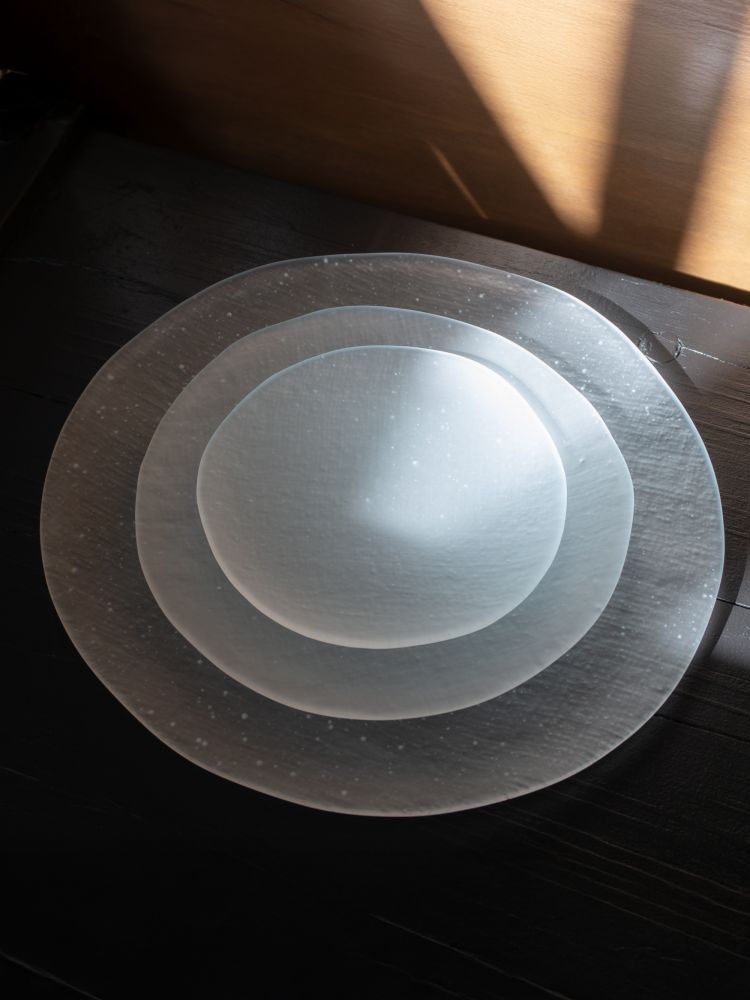 - 4명의 작가가 함께하는 dito140의 대표작 모시 플레이트는 한국 전통 직물인 모시천의 섬세한 질감을 유리 위에 담아냅니다. 비침과 결, 겹쳐짐이 만들어내는 깊이와 리듬은 동양적 미감과 현대적 감각을 동시에 보여주며, 시그니처로 자리 잡았습니다