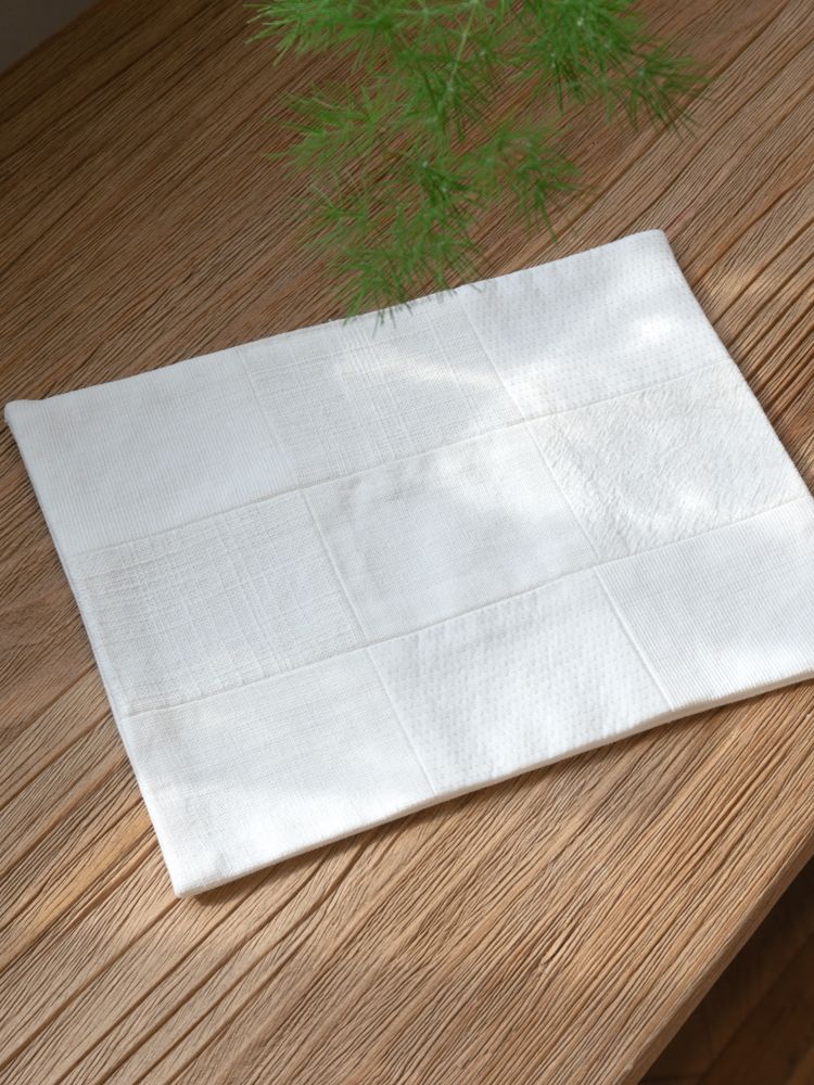 - 같은 흰색 톤 안에서 서로 다른 질감의 9조각 원단을 하나하나 이어 붙여 완성한 티 매트입니다. 은은하지만 결이 다른 소재가 만들어내는 차분하고 독특한 분위기가 공간을 부드럽게 채워줍니다.