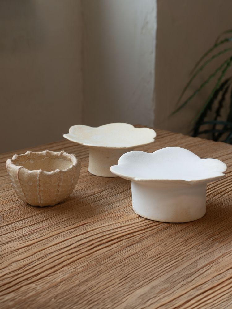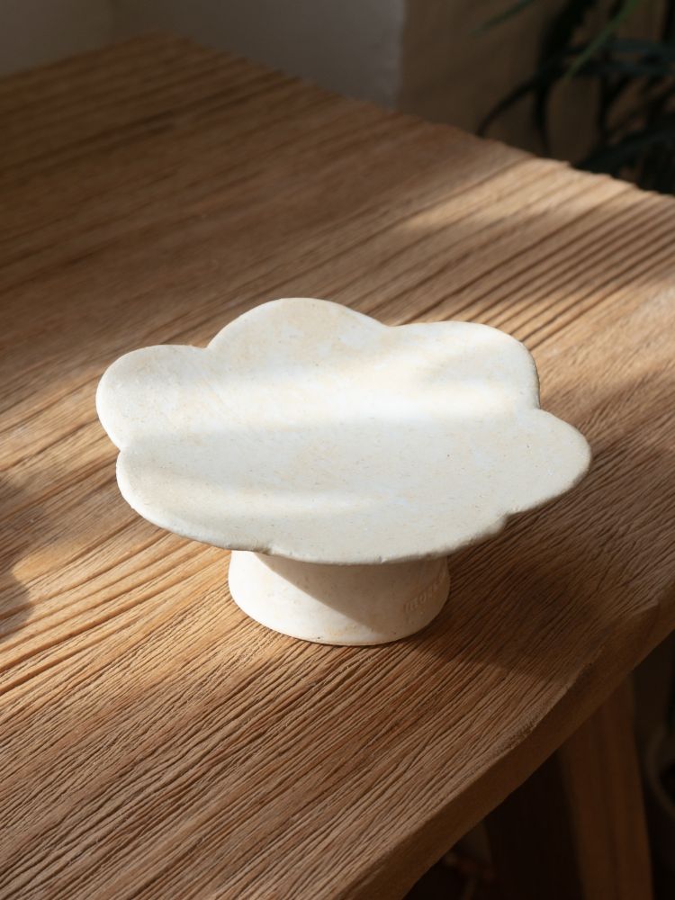 - 위쪽은 꽃잎을 닮은 부드러운 실루엣의 플레이트로, 디저트나 작은 찻자리를 담기에 좋은 사이즈입니다. 자연스러운 곡선과 은은한 유약의 흐름이 테이블에 여유로운 분위기를 더해줍니다.
