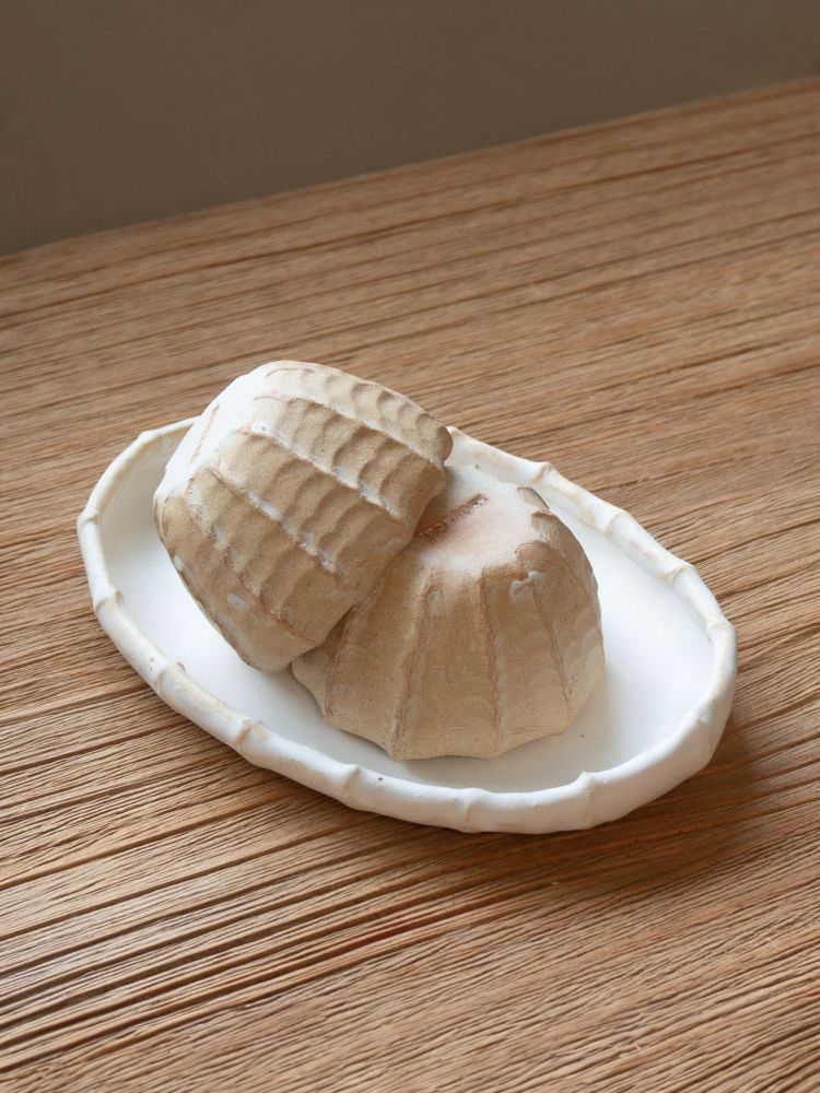 잔잔한 파도의 리듬감이 느껴지는 기물이에요. 작가는 바닷가 모래알과 조개껍데기에서 받은 영감을 질감과 형태로 풀어내며, 손으로 빚은 흔적을 고스란히 남깁니다.
