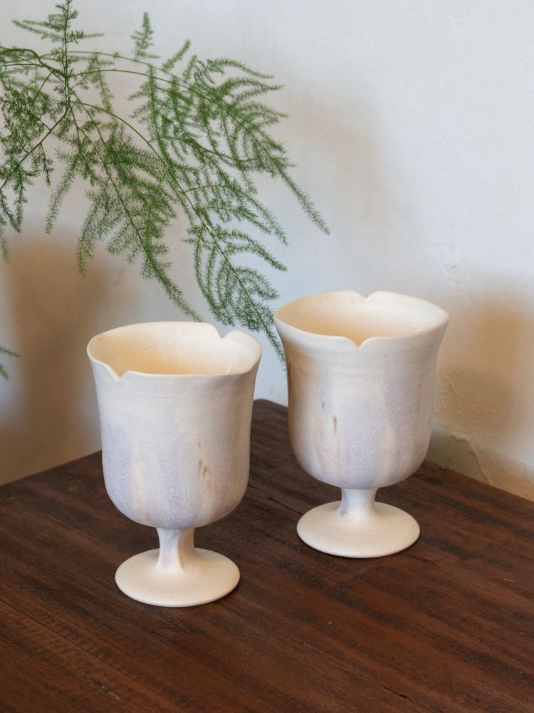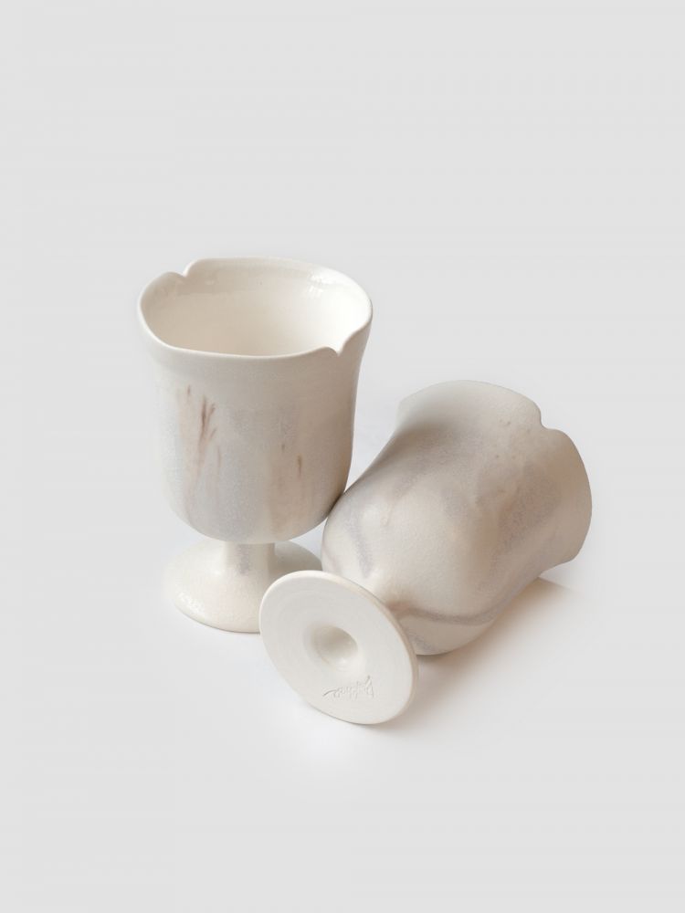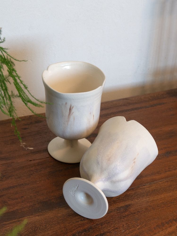 - 넉넉한 사이즈의 고블렛 잔으로, 물고기나 고래의 꼬리에서 영감을 받아 만들어졌습니다. 유선형으로 뻗은 꼬리의 형태는 물을 가르며 앞으로 나아가는 힘의 원천이자, 작가가 수영을 통해 동경해온 ‘움직임의 아름다움’을 담고 있습니다.