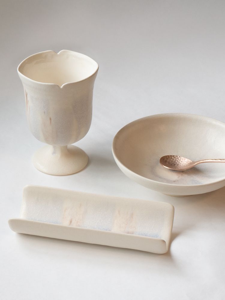 - 작가는 물속에서 느껴지는 감각을 도자기 위에 풀어내는 작업을 합니다. 유영의 움직임, 번지는 빛과 색은 작가에게 중요한 영감의 원천이며, 이는 형태와 유약의 실험으로 이어집니다. 일상의 기물 위에 물의 흔적을 남기듯, 때로는 유쾌한 상상력으로 도자기가 지닌 무게감을 다른 방식으로 확장합니다.