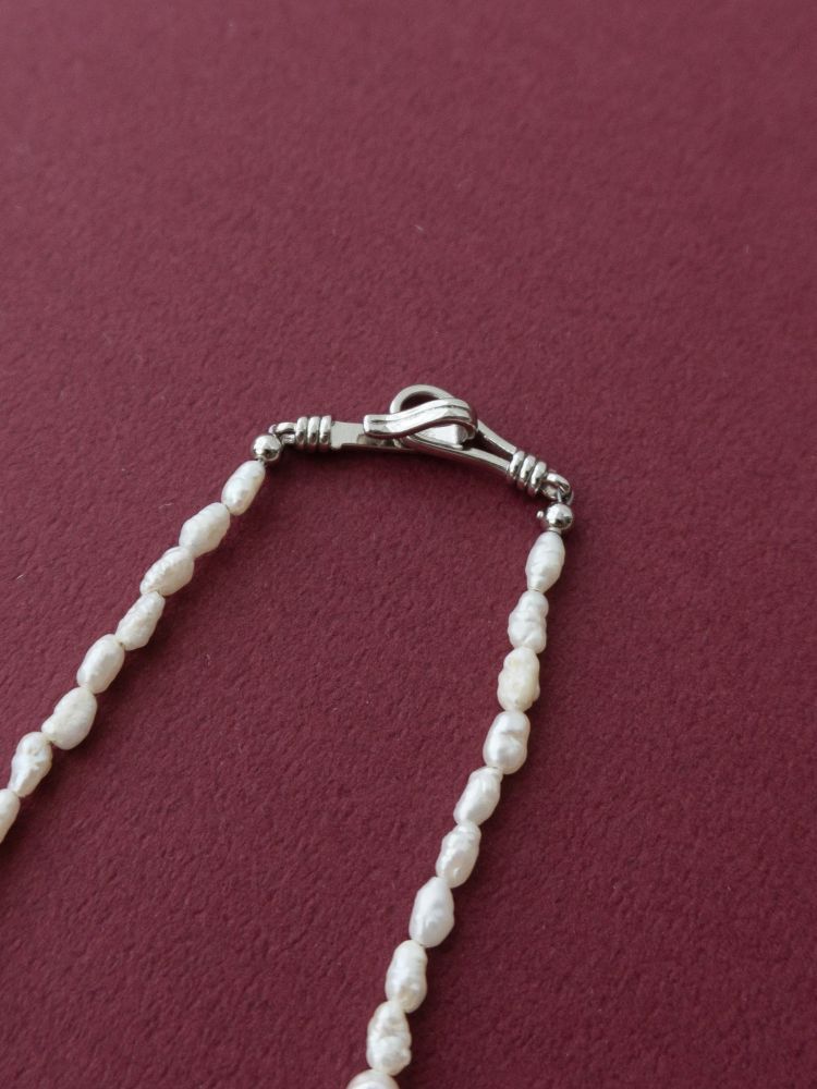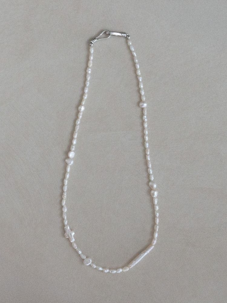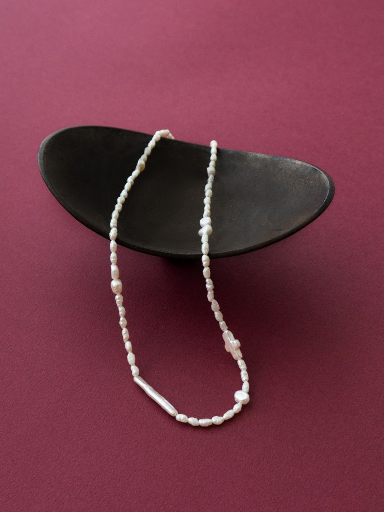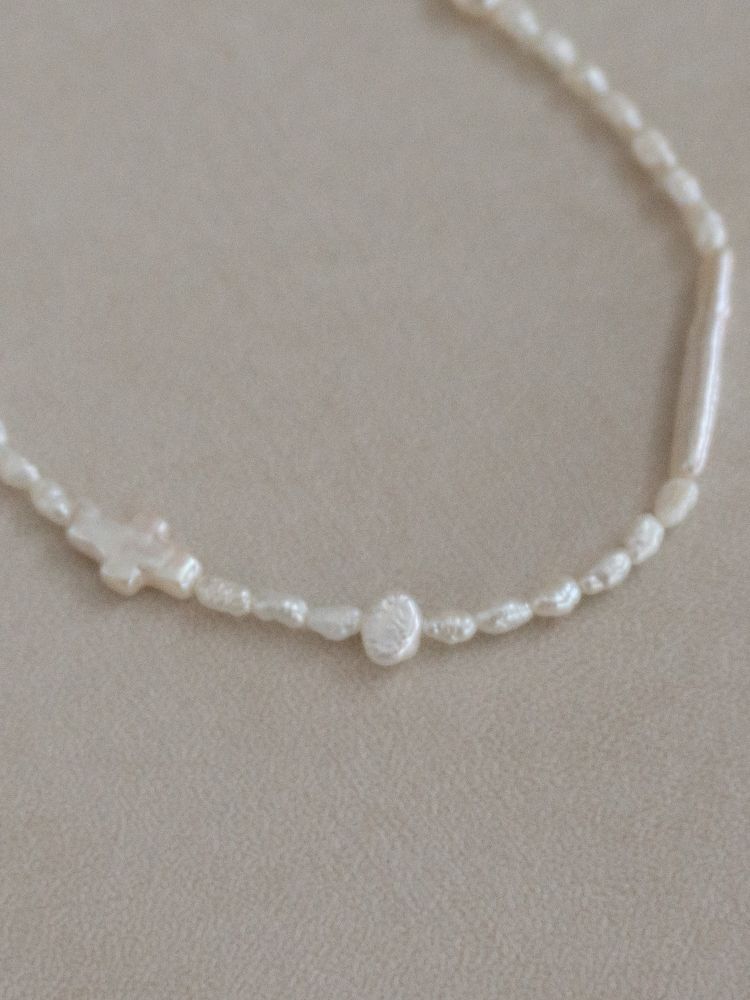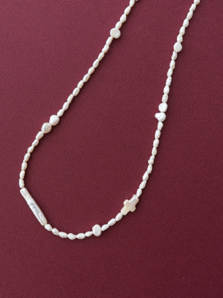 - 담수진주의 은은한 광택 위에 십자가 모티프를 더한 목걸이는 알의 크기와 형태가 일정하지 않은 러프하지만 한 알 한 알 섬세하게 골라졌어요 .과하게 화려하지 않으면서도 존재감이 살아, 데일리와 격식 자리 모두 부드럽게 어울립니다. 연말 연시 크고 작은 모임에 축복 같은 포인트로 착용해 보세요.