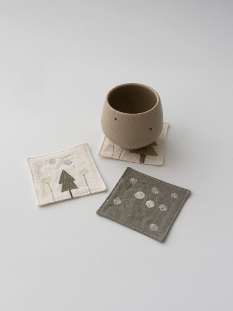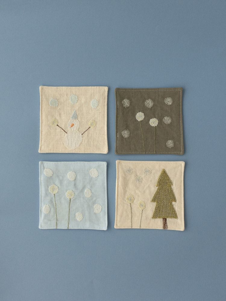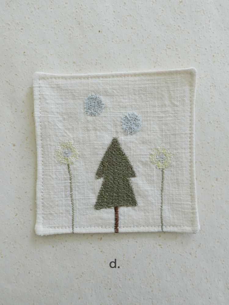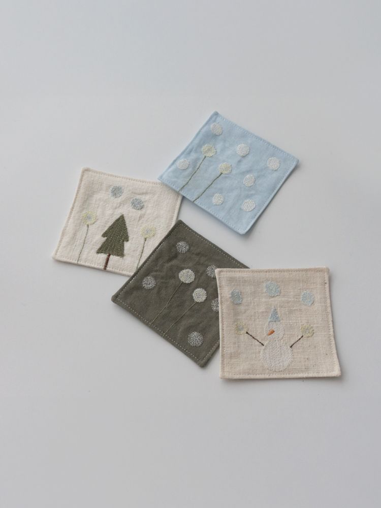 그런 ‘일상 속 텍스타일’을 통해 누구나 예술에 쉽게 닿기를 바랍니다.겨울의 의미를 담아 선물하기 좋은 자수 티코스터. 눈꽃송이, 눈사람, 겨울나무 등의 간결한 형태의 자수가 은은한 컬러감의 원단 위에 섬세하게 새겨져 있습니다.